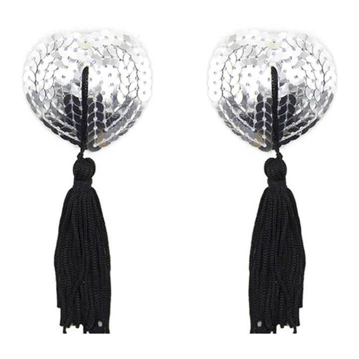 Unas pezoneras bonitas, atrevidas y eróticas. Estas pezoneras con forma de corazón, son autoadhesivas. La base de las mismas está recubierta de lentejuelas y de ellas cuelgan unas eróticas borlas ideal para sorprender